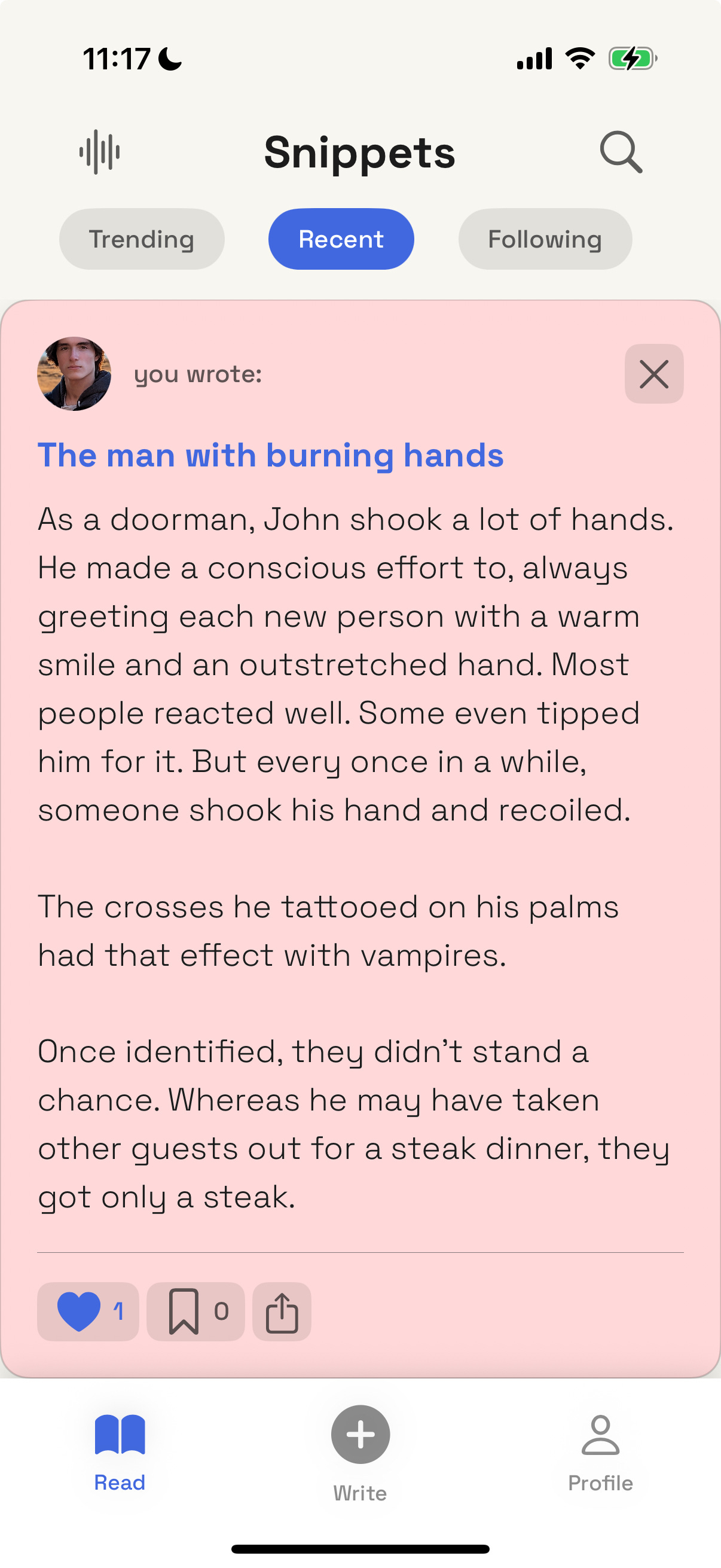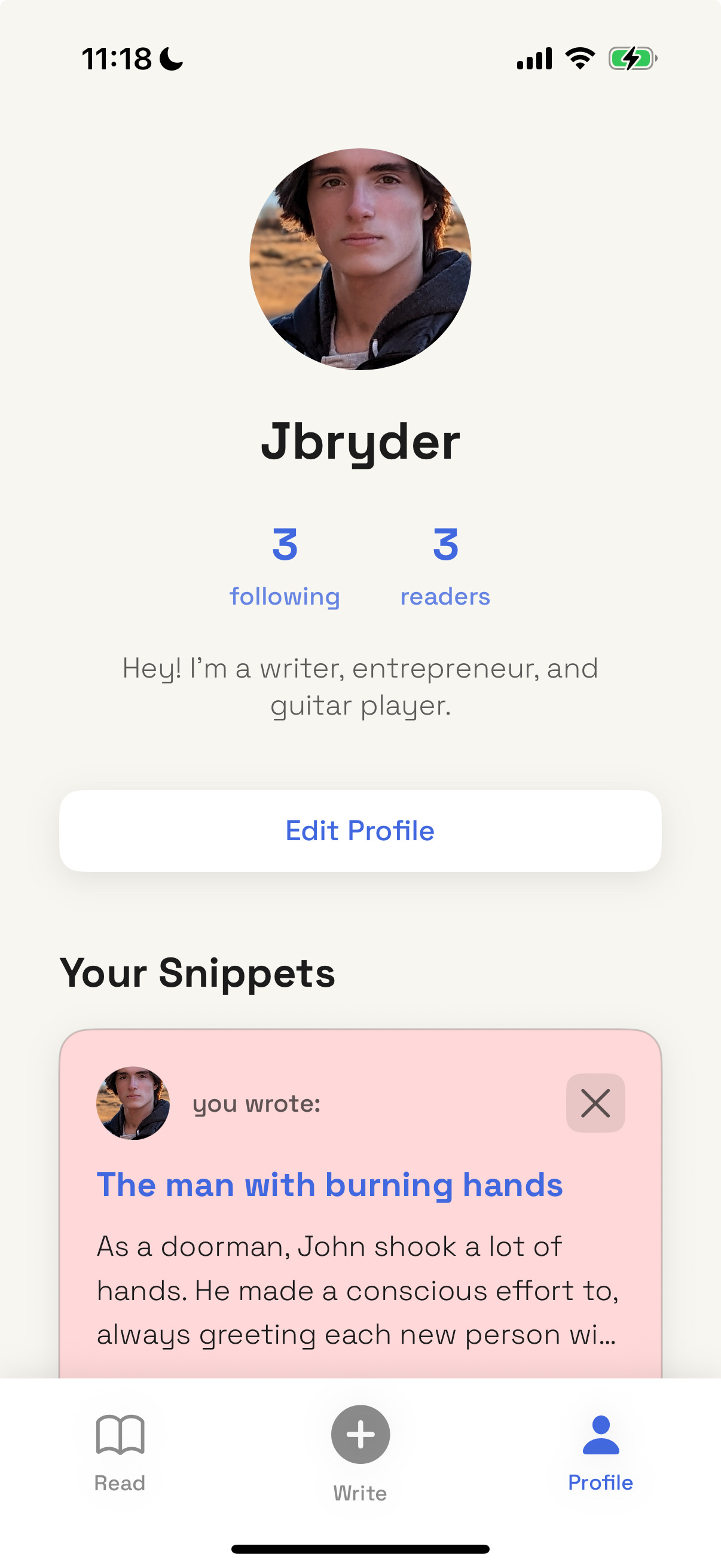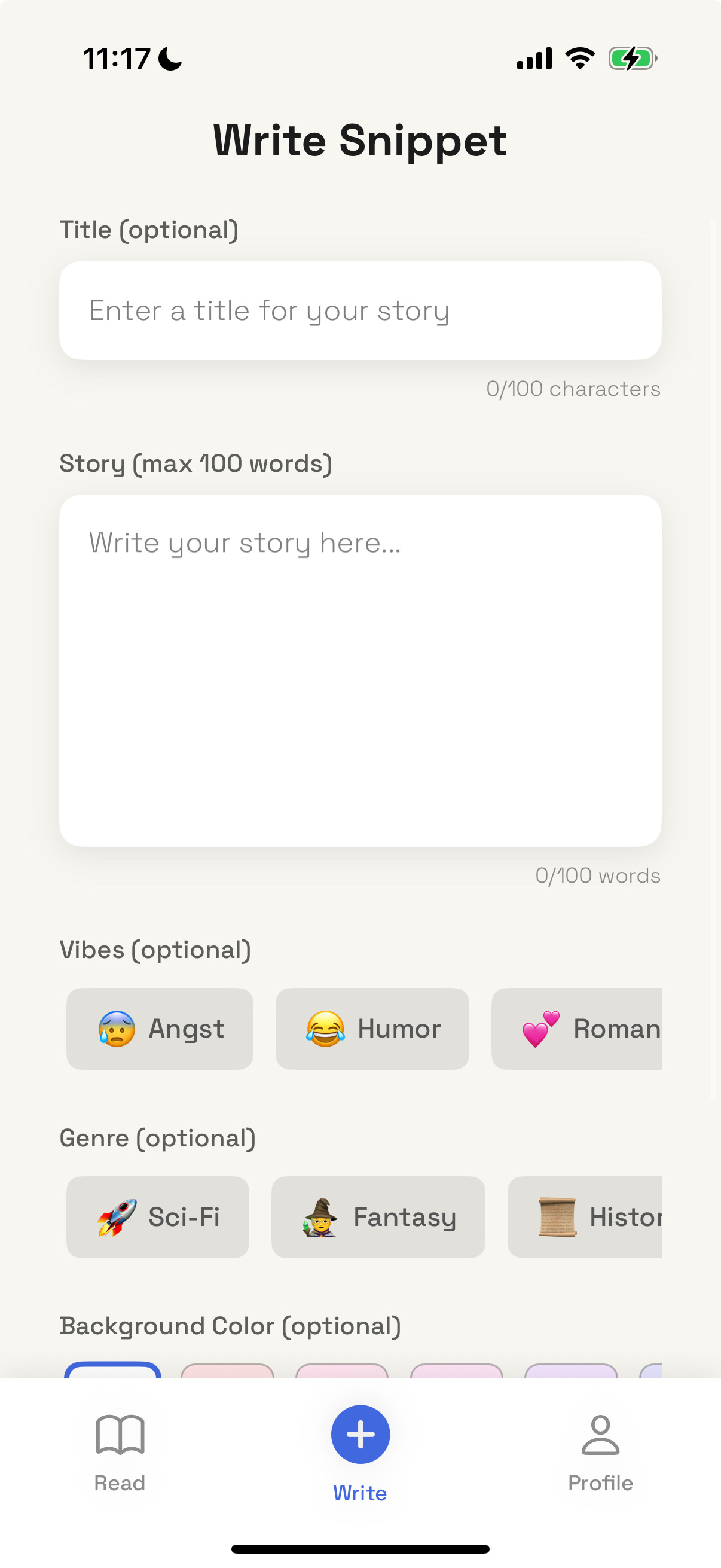 Hey guys! Thank you very much for expressing your interest in this project. The idea for it came from a conversation I had with some writers/readers in my community about how difficult it is to find the time and motivation to write/read. The goal of this app is to make storytelling effortless and irresistible, giving writers a stage anywhere and giving readers a meaningful alternative to mindless doomscrolling. It is incredibly early stage, though I may begin testing it with real users soon if it seems like something writers/readers would actually use.