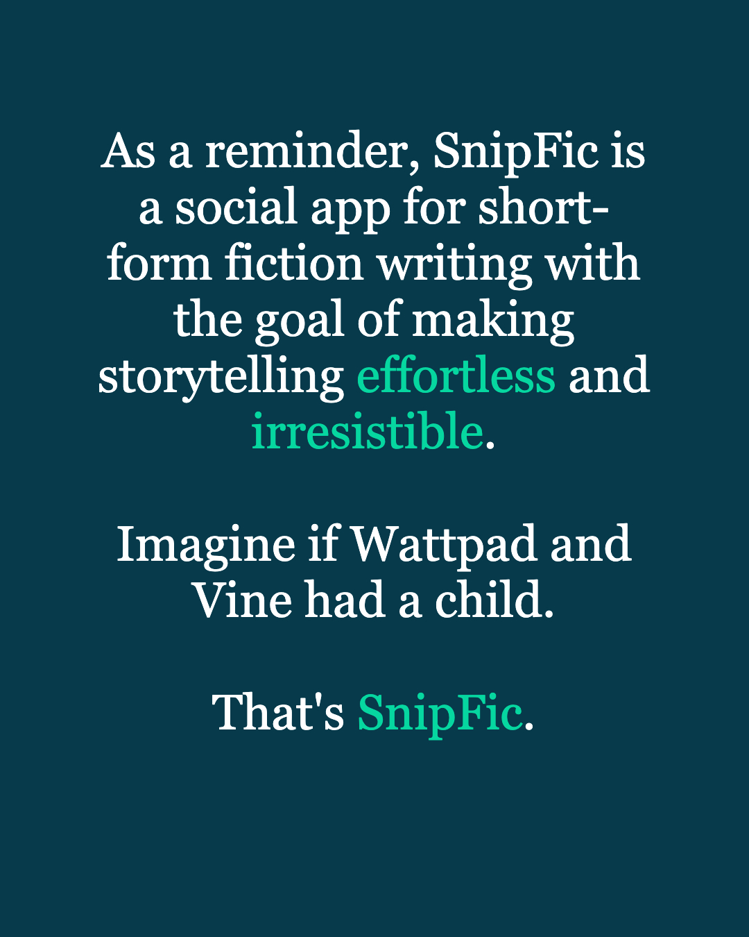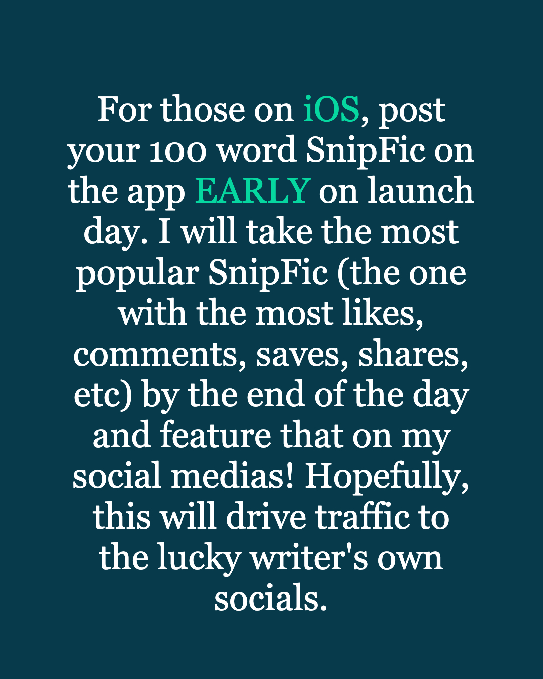 For the iOS users, I’ll be picking the most popular SnipFic from the app at the end of launch day. You’re totally free to promote your SnipFic on other platforms to drive people to engage with it on the SnipFic app.