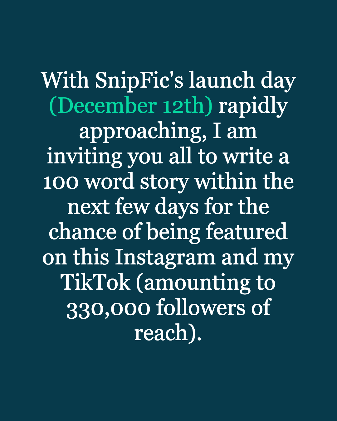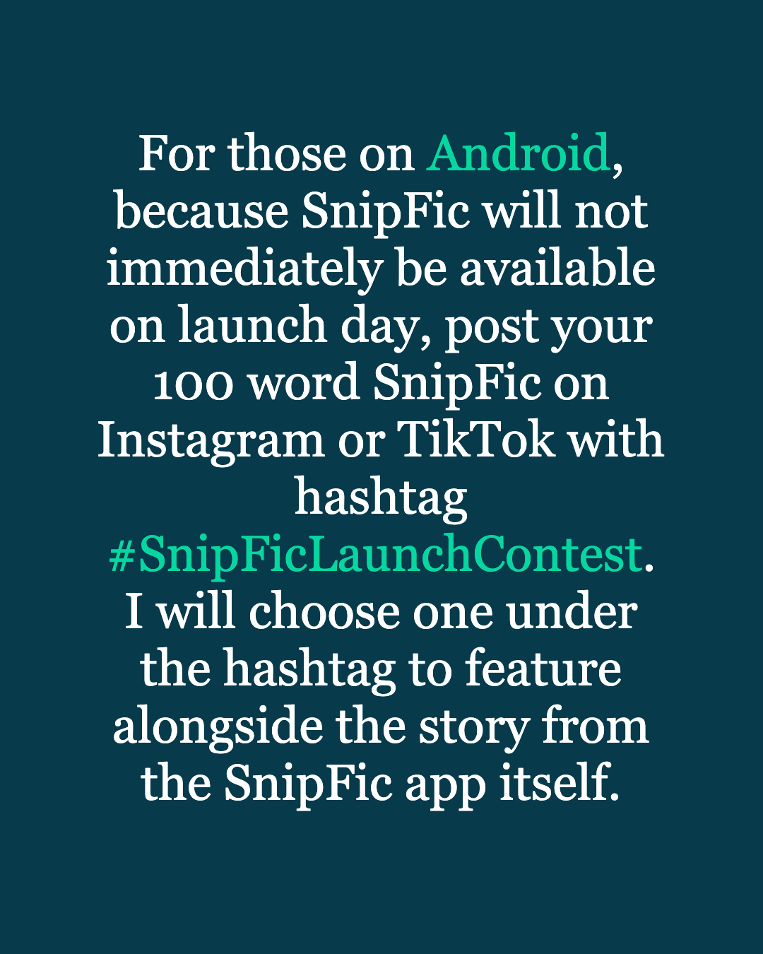 For Android users, simply post your story on Instagram or TikTok with #SnipFicLaunchContest ! It would be nice if you could tag me as well, so I don’t miss any. I’ll be choosing one from under the hashtag to accompany the story chosen in the SnipFic app.